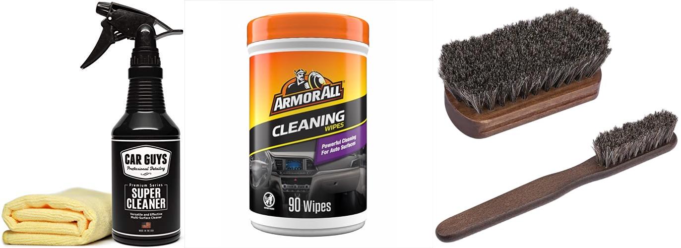 Brushes are common. They often have soft bristles for fabric and firmer ones for tougher jobs. Microfiber cloths are excellent for wiping and buffing. Some kits might include sponges or spray bottles.